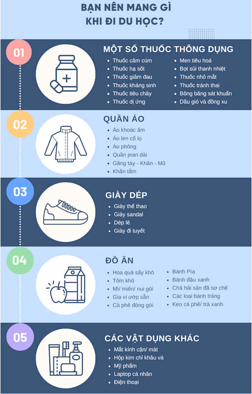 Thực ra món bạn cần mang theo nhất là tiền vì ở mọi nơi đều có chợ Châu Á. Tuy nhiên, có một số thứ bạn nên mang dự phòng từ Việt Nam để tiết kiệm sinh hoạt phí và sử dụng khi cần gấp trong thời gian đầu.